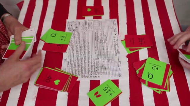 In Racing Patience ICU there are just two players. One draws a central card that describes the patient stats when entering ICU. Starting at the same time one player represents the ICU team trying to bring the patient back into the normal or survivable ranges for blood pressure, heart rate, blood oxygenation and rate of respiration. The other player, death is attempting to take the patient out of those survivable range. The cards have plus or minus numbers that can be attributed to one of the four sets of data. Both players have to track the four parameters, keep a rough tally in their head of the changes in the patient stats as each card is added to one of the four stacks. The players will rotate through their own cards in groups of three able to play the top card only. The card that may save the situation or cause the death of the patient may be just out of reach and there is no time to consider the ethics of particular interventions that drive swinging changes in the patient’s statistical signs. At the end of a few minutes the game is called and a countback determines who has won.